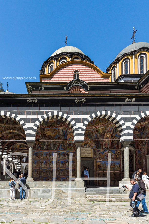 Bulgaria, Kyustendil Region, Rila, Mountain, Rila Monastery, Monastery, Eastern Orthodox, Orthodox, church, bulgarian, John of Rila, Ivan Rilski, Rilski manastir, Saint Ivan of Rila, Saint (John) of Rila, medieval, architecture, famous, Outdoor, icons, landmark, sight, sightseeing, Pilgrimage, christianity, building, antique, ancient, nature, monument, landscape, travel, tourism, bell tower, christian, ages, medieval, destination, tourists, faith, religious, Unesco World Heritage site, courtyard, Unesco, heritage, fortification, tower, bell, old